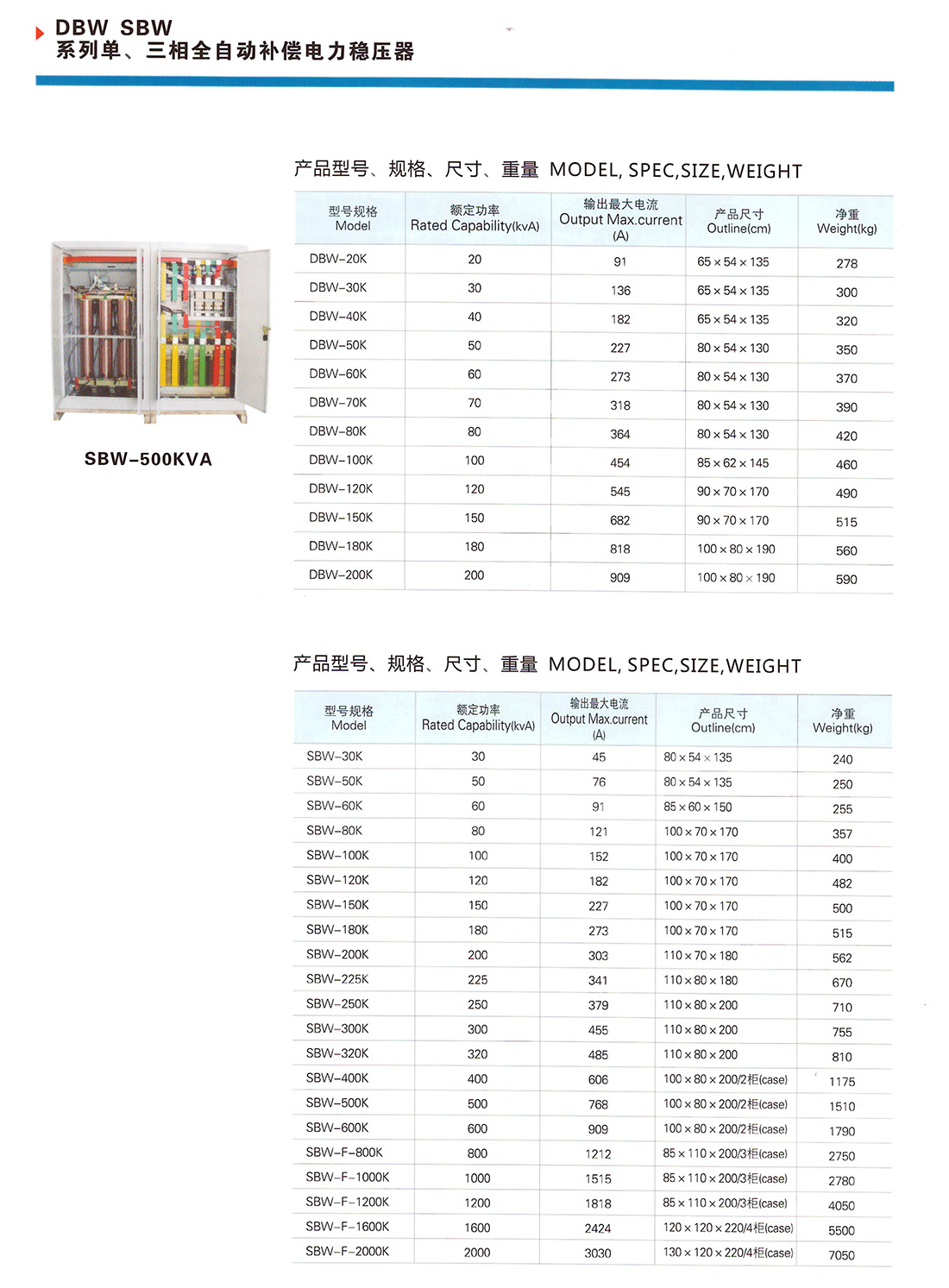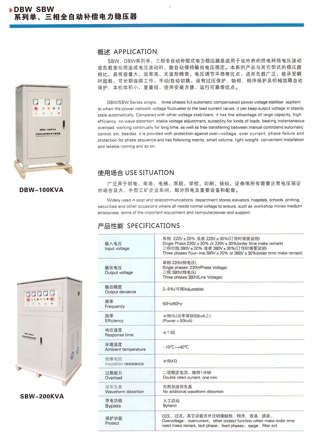 SBW、DBW系列單、三相全自動(dòng)補(bǔ)償式電力穩(wěn)壓器是適用于當(dāng)外界的供電網(wǎng)絡(luò)電壓波動(dòng)或負(fù)載變化而造成電壓波動(dòng)時(shí),能自動(dòng)保持輸出電壓穩(wěn)定。本系列產(chǎn)品與其它型式的穩(wěn)壓器相比,具有容量大、效率高、無(wú)波形畸變、電壓調(diào)節(jié)平穩(wěn)等優(yōu)點(diǎn),適用負(fù)載廣泛,能承受瞬時(shí)超載,可長(zhǎng)期連續(xù)工作,手動(dòng)/自動(dòng)切換,設(shè)有過(guò)壓保護(hù)、缺相、相序保護(hù)及機(jī)械故障自動(dòng)保護(hù),本機(jī)體積小,重量輕,使用安裝方便,運(yùn)行可靠等優(yōu)點(diǎn)。