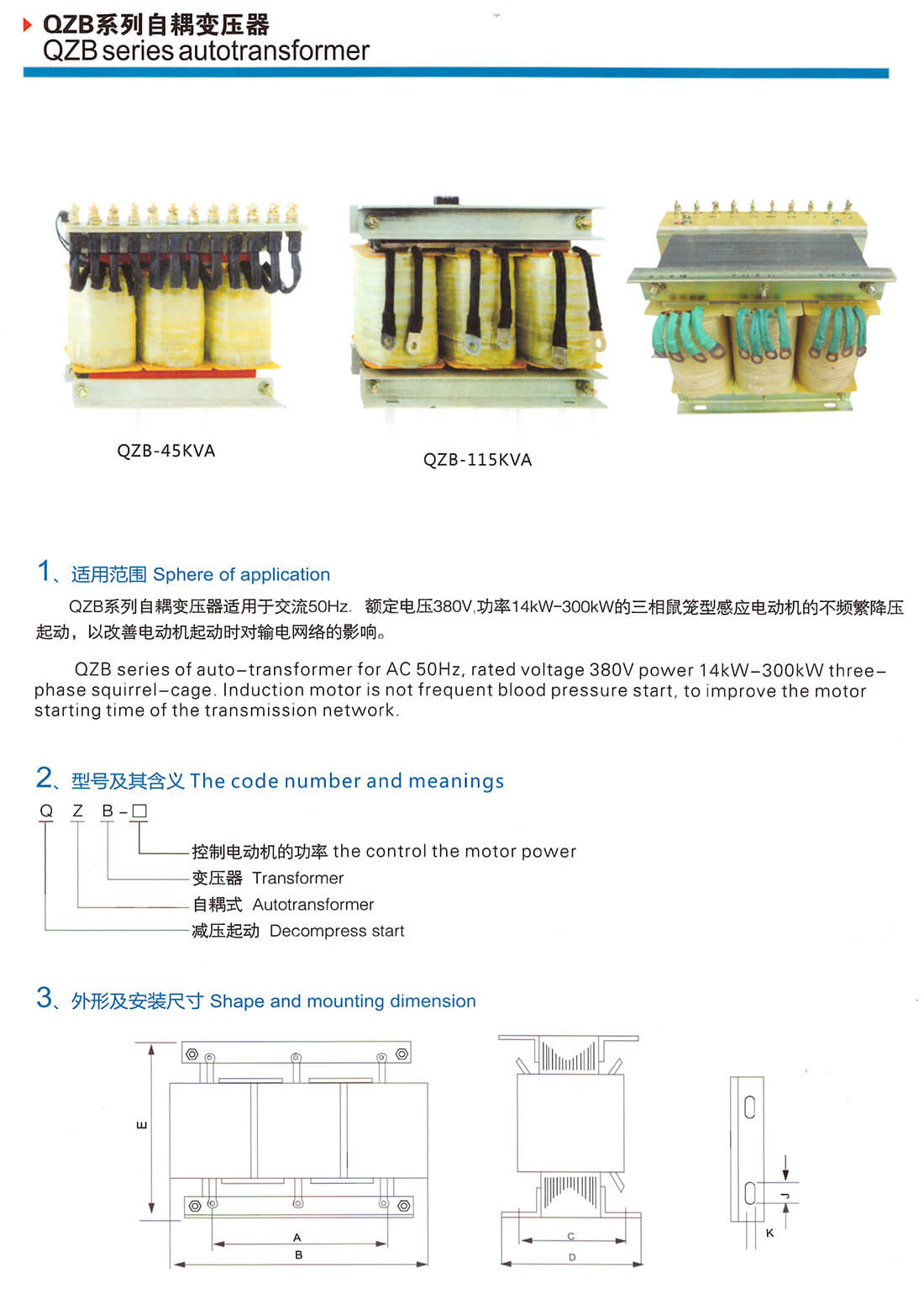 QZB系列自耦變壓器適用于交流50Hz.額定電壓380V,功率  14kW-300kW的三相鼠籠型感應電動機的不頻繁降壓起動,以改善電動機起動時對輸電網(wǎng)絡的影響。